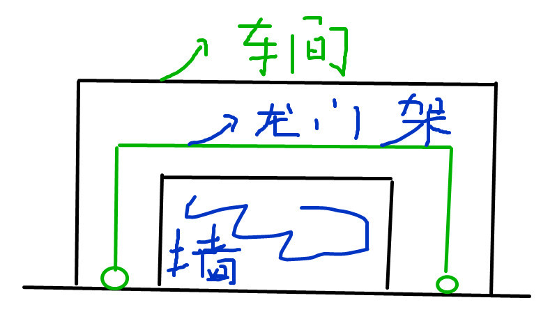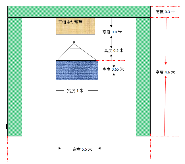 龙门架要求尺寸高4.8米,长5.5米,在工厂车间内使用,被吊物长6米,宽1米,高0.65米,重5吨,两台龙门架同时起吊,采用ea圆型吊装带配合作用,要求被吊物底部距离地面的高度不得低于2.4米。因为6在车间内有一面高度为2.35米的墙面,需要跨越过去。龙门架可以移动,可以拆解。现场草图如图所示: